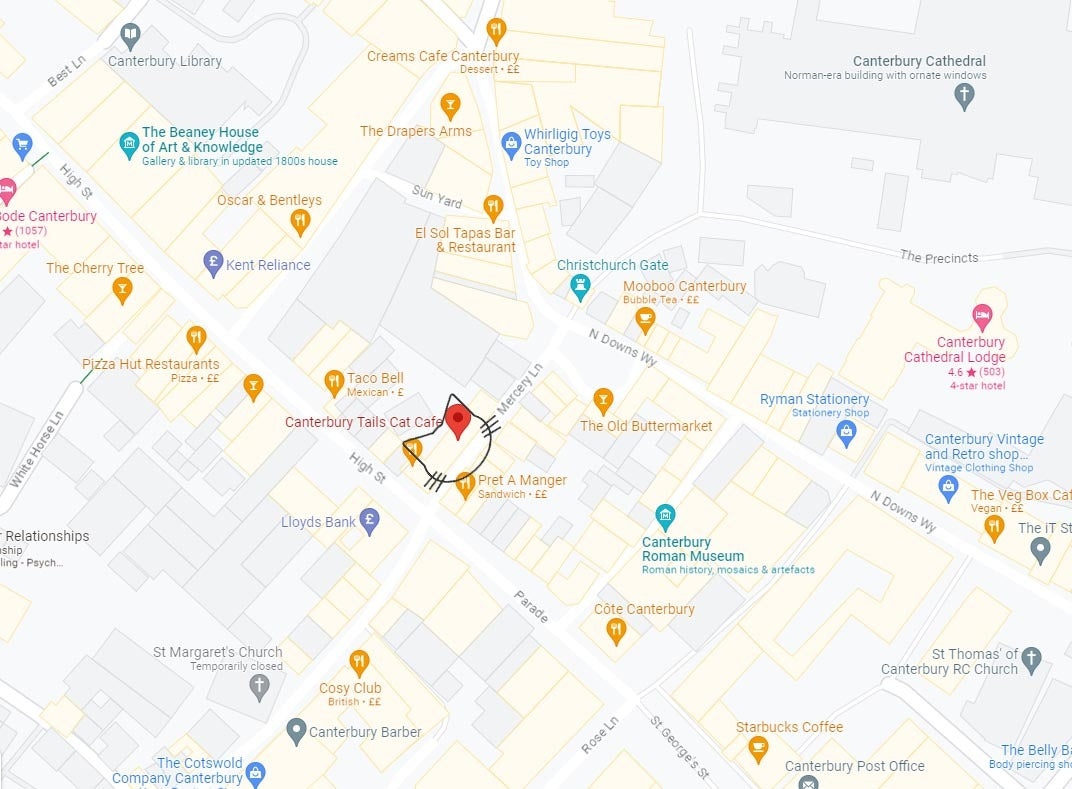 We are right in the heart of the city, between the main High Street and Canterbury Cathedral gates. Just follow your whiskers and look for the window with some paw-sitively adorable cats lounging about - you can't miss us!
